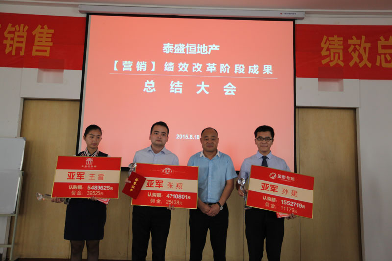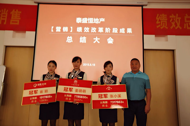 隨后,大會對各項目的銷售的先進個人進行表彰,宣讀銷售業(yè)績,高業(yè)績高績效的改革模式,不僅激勵銷售人員勇創(chuàng)佳績,更是給予現(xiàn)場的與會人員極大的震撼,尤其是班總和孫總分別對銷亞和銷冠進行的頒獎儀式使得現(xiàn)場的氛圍達到了高潮!