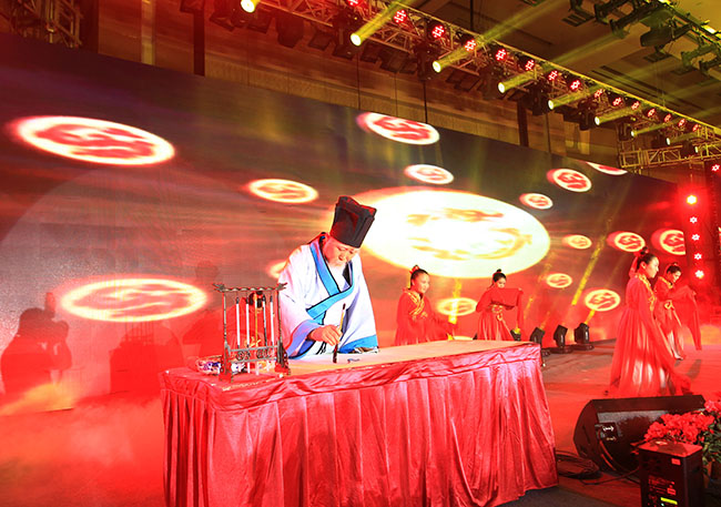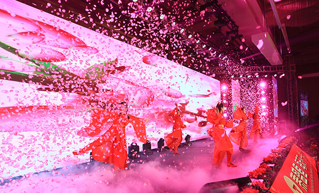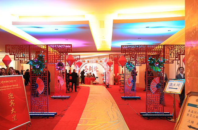 本次晚會采用中國傳統(tǒng)文化的主題,參會人員著中國風(fēng)禮服入場,現(xiàn)場布置也透著濃厚的中國風(fēng)味,迎賓大道的黃色地毯、道路兩旁的燈籠、鏤空的大紅門、綠瓦白墻的合影區(qū)……隨處可見的中國傳統(tǒng)文化元素讓參會人員欣喜不已,紛紛駐足拍照留念。