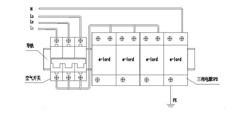 1. 已有可靠接地系統(tǒng),在配電柜(避雷器安裝處)的接地樁 (條)上進(jìn)行接地電阻的測(cè)定,電阻應(yīng)符合相關(guān)規(guī)范要求。(或 滿足國(guó)家、部級(jí)標(biāo)準(zhǔn))。 2. 配電柜中應(yīng)留有安裝避雷器的空間,水平寬度為18×4(72) mm,上下寬度為大于150mm(考慮接線的方便),前后為大于 100mm,同時(shí)應(yīng)有長(zhǎng)為大于72mm的Ω型導(dǎo)軌,以固定避雷器。 3. 配套的配電柜應(yīng)滿足國(guó)家相關(guān)產(chǎn)品標(biāo)準(zhǔn)。 注:L為電源相線;N為電源零線;PE為地線。 1. 相線用6-25mm2紅色/綠色/黃色導(dǎo)線連接; 零線用6-25mm2黑色導(dǎo)線連接; 地線用16-35mm2黃綠色導(dǎo)線連接。 2. 為防止短路,在避雷器的上端應(yīng)安裝相應(yīng)的,曲線C的空氣開(kāi) 關(guān)。 | 應(yīng)檢查空氣開(kāi)關(guān)已經(jīng)合閘導(dǎo)通,以保證避雷器處于運(yùn)行狀態(tài); 本產(chǎn)品只適用于室內(nèi)使用; 不要在雷雨天安裝。 |