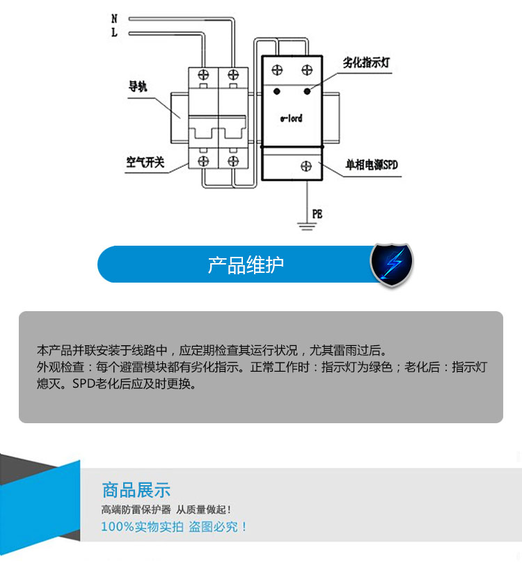 1. 已有可靠接地系統(tǒng),在配電柜(避雷器安裝處)的接地樁 (條)上進(jìn)行接地電阻的測定,電阻應(yīng)符合相關(guān)規(guī)范要求。 (或滿足國家、部級標(biāo)準(zhǔn))。 2. 配電柜中應(yīng)留有安裝避雷器的空間, 注:L為電源相線;N為電源零線;PE為地線。 | 應(yīng)檢查空氣開關(guān)已經(jīng)合閘導(dǎo)通,以保證避雷器處于運(yùn)行狀態(tài); 不要在雷雨天安裝。 |